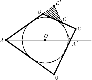 Предположим, что четырехугольникABCDпостроен. Для определенности будем считать, чтоAD>AB. Пусть O — центр вписанной окружности; точка D'симметрична Dотносительно прямойAO;A' — точка пересечения прямыхAOи DC,C' — точка пересечения прямыхBCи A'D'(рис.). В треугольникеBC'D'известны сторонаBD'и прилегающие к ней углы$\angle$D'BC'= 180o-$\angle$Bи $\angle$BD'C'=$\angle$D. Построим треугольникBC'D'по этим элементам. Так какAD'=AD, то можно построить точку A. Затем строим точку Oпересечения биссектрис угловABC'и BD'C'. Зная положение точки O, можно построить точку Dи вписанную окружность. Точка Cявляется точкой пересечения прямойBC'и касательной к окружности, проведенной из точки D.