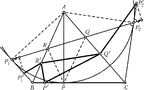 ПустьPQR — треугольник, образованный основаниями высот треугольникаABC,P'Q'R' — любой другой треугольник, вписанный в треугольникABC. Пусть, далее, точки P1и P2(соответственно,P1' и P2') симметричны точке P(соответственно P') относительно прямыхABи AC(рис.). Точки Qи Rлежат на отрезкеP1P2(см. задачу 1.57), поэтому периметр треугольникаPQRравен длине отрезкаP1P2. А периметр треугольникаP'Q'R'равен длине ломанойP1'R'Q'P2', т. е. он не меньше длины отрезкаP1'P2'. Остается заметить, что(P1'P2')2=P1P22+ 4d2, где d — расстояние от точки P1' до прямойP1P2.
