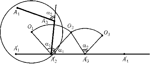 Предположим, что лев бежал по ломанойA1A2...An. Распрямим траекторию движения льва следующим образом. Повернем относительно точки A2арену цирка и дальнейшую траекторию так, чтобы точка A3попала на лучA1A2. Затем повернем относительно точки A3арену цирка и дальнейшую траекторию так, чтобы точка A4попала на лучA1A2и т. д. Центр Oарены цирка переходит при этом последовательно в точкиO1=O,O2,...,On - 1; точкиA1,...,Anпереходят в точкиA1',...,An', лежащие на одной прямой (рис.). Пусть $\alpha_{i-1}^{}$ — угол поворота льва в точке Ai'. Тогда$\angle$Oi - 1Ai'Oi=$\alpha_{i-1}^{}$и Ai'Oi - 1=Ai'Oi$\le$10, поэтомуOiOi - 1$\le$10$\alpha_{i-1}^{}$. Следовательно,30 000 =A1'An'$\le$A1'O1+O1O2+...+On - 2On - 1+On - 1An'$\le$10 + 10($\alpha_{1}^{}$+...+$\alpha_{n-2}^{}$) + 10, т. е.$\alpha_{1}^{}$+...+$\alpha_{n-2}^{}$$\ge$2998.