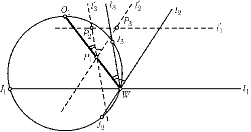 а) Пусть l1',l2' и l3' — соответственные прямые фигур F1,F2и F3, причем li'|li; эти прямые образуют треугольникP1P2P3. При поворотной гомотетии с центром O3, переводящей F1в F2, прямые l1и l1' переходят в l2и l2', поэтому при гомотетии с центром O3, переводящей прямую l1в l1', прямая l2переходит в l2'. Следовательно, прямаяP3O3проходит через точку W. Аналогично прямыеP1O1и P2O2проходят через точку W, а значит, точка Wлежит на окружности подобия фигур F1,F2и F3(см. задачу 19.49, б)). б) Отношение расстояний от точки O1до прямых l2' и l3' равно коэффициенту поворотной гомотетии, переводящей F2в F3, а угол P1треугольникаP1P2P3равен углу ее поворота. Поэтому$\angle$(O1P1,P1P2) зависит лишь от фигур F2и F3. А так как$\angle$(O1W,WJ3) =$\angle$(O1P1,P1P2), то дугаO1J3фиксирована (рис.), а значит, точка J3фиксирована. Аналогично доказывается, что точки J1и J2фиксированы.