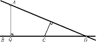 Предположим, что не все данные точки лежат на одной прямой. Проведем через каждую пару данных точек прямую (этих прямых конечное число) и выберем наименьшее ненулевое расстояние от данных точек до этих прямых. Пусть наименьшим будет расстояние от точки Aдо прямойBC, где точки Bи Cданные. На прямойBCлежит еще одна из данных точек — некоторая точка D. Опустим из точки AперпендикулярAQна прямуюBC. Две из точек B,Cи Dлежат по одну сторону от точки Q, например Cи D. Пусть для определенностиCQ<DQ(рис.). Тогда расстояние от точки Cдо прямойADменьше, чем расстояние от точки Aдо прямойBC, что противоречит выбору точки Aи прямойBC.