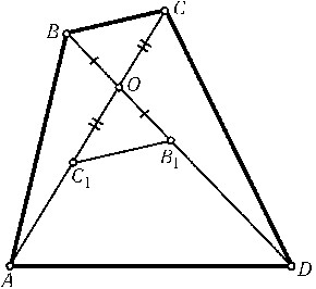 Для определенности можно считать, чтоAO$\ge$COи DO$\ge$BO. Пусть точки B1и C1симметричны точкам Bи Cотносительно точки O(рис.). Так как треугольникB1OC1лежит внутри треугольникаAOD, тоPAOD$\ge$PB1OC1=PBOC, причем равенство достигается, только еслиB1=DиC1=A(см. задачу 9.27, б)). Следовательно,ABCD — параллелограмм. ПоэтомуAB-BC=PABO-PBCO= 0, т. е.ABCD — ромб.