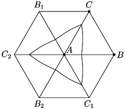 Рассмотрим кривую, делящую равносторонний треугольникABCна две фигуры площадиS/2. Возможны два случая: либо кривая отделяет одну из вершин треугольника (для определённости вершинуA) от противоположной стороны, либо кривая замкнута. Во втором случае согласно задаче 22.BIs14длина кривой не превосходит$\sqrt{2\pi S}$. Рассмотрим теперь первый случай. Образы кривой при последовательных симметриях относительно прямыхAC,AB1,AC2,AB2иAC1(рис.) образуют замкнутую кривую, ограничивающую фигуру площади 3S. Поэтому искомая кривая — дуга окружности радиуса$\sqrt{3S/\pi}$с центром в точкеA. Её длина равна$\sqrt{\pi S/3}$<$\sqrt{2\pi S}$.