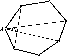 Рассмотрим пятиугольники, остающиеся при выбрасывании пар соседних вершин семиугольника. Достаточно проверить, что любые три из них имеют общую точку. Для трех пятиугольников выбрасывается не более шести различных вершин, т. е. одна вершина остается. Если вершина Aне выброшена, то заштрихованный на рис. треугольник принадлежит всем трем пятиугольникам.
