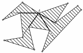 а) Если многоугольник выпуклый, то утверждение очевидно. Предположим теперь, что внутренний угол многоугольника при вершине A больше 180°. Видимая часть стороны видна из точки A под углом меньше 180°, поэтому из точки A видны части по крайней мере двух сторон. Следовательно, существуют лучи, выходящие из точки A, на которых происходит смена (частей) сторон, видимых из точки A (на рис. изображены все такие лучи). Каждый из этих лучей задаёт диагональ, целиком лежащую внутри многоугольника.