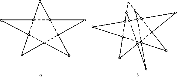 Предположим, что существует тринадцатиугольник, у которого на любой прямой, содержащей сторону, есть еще хотя бы одна сторона. Проведем через все стороны этого тринадцатиугольника прямые. Так как у него тринадцать сторон, то на одной из них лежит нечетное число сторон, т. е. на одной прямой лежат по крайней мере три стороны. У них есть 6 вершин и через каждую вершину проходит прямая, на которой лежат по крайней мере две стороны. Поэтому всего у этого тринадцатиугольника не менее3 + 2 . 6 = 15 сторон, чего не может быть. Для четногоn$\ge$10 требуемый пример — контур к звездык (рис., а); идея построения примера для нечетного nпоказана на рис., б).