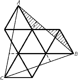 Сложим 7 одинаковых правильных треугольников, как показано на рис. ТогдаABC — правильный треугольник. Ясно, что заштрихованные треугольники равны. Теперь легко понять, что на рис. фактически изображено, как разрезать правильный треугольникABCшестью прямыми на части, из которых можно сложить 7 одинаковых правильных треугольников.