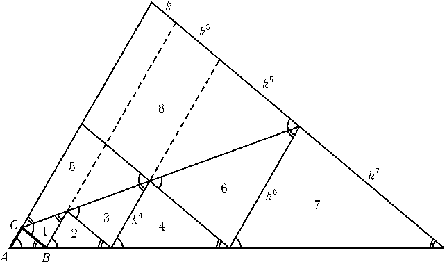 а) Можно считать, чтоBC/AC=k> 1. Приложим к треугольникуABCтреугольники 1, 2, 3, 4 и 5 (см. рис.). Может оказаться, что треугольники 4 и 5 равны, т. е.k+k3=k4. В этом случае дополним конструкцию треугольниками 6 и 7, а треугольник 5 заменим треугольником 8. Тогда треугольники 7 и 8 не равны, т. е.k6 ≠ k+k3+k5. В самом деле, так какk+k3=k4, тоk6=k2(k+k3) =k3+k5<k+k3+k5.