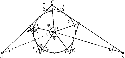 = ($\pi$+$\beta$)/4),$\phi_{3}^{}$=$\pi$-$\phi_{2}^{}$-$\gamma$/2 = 3$\pi$/4 -$\alpha$/4 -$\gamma$/2 <$\pi$/2 + ($\pi$/4 -$\gamma$/2) <$\pi$/2,$\phi_{4}^{}$=$\pi$- 2$\phi_{2}^{}$= ($\pi$-$\alpha$)/2 <$\pi$/2 и$\phi_{5}^{}$=$\pi$-$\phi_{2}^{}$-