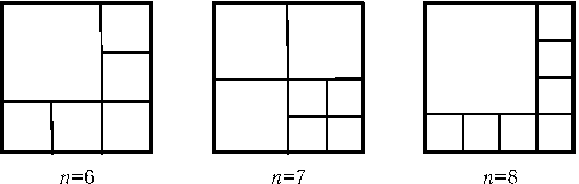 Пусть квадрат разрезан наmквадратиков. Разрежем один из этих квадратиков на 4 квадратика. При этом квадрат будет разрезан наm+ 3 квадратиков. Остается заметить, что квадрат можно разрезать на 6, 7 и 8 квадратиков (рис.).