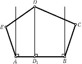 ПустьAB — наибольшая сторона пятиугольника. Рассмотрим полосу, заданную перпендикулярами к сторонеAB, проведенными черезAиB. Так как углыEABиABCтупые, точкиEиCлежат вне этой полосы. Поэтому точкаDлежит внутри полосы, так как иначе длина одного из отрезковEDиDCбыла бы больше длины отрезкаAB. Обозначим проекцию точкиDна отрезокABчерезD1(рис.). Тогда круги с диаметрамиADиBDполностью покрывают четырехугольникиAEDD1иBCDD1.