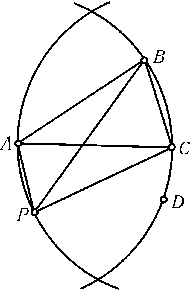 Назовемдиаметромотрезок длиной d, соединяющий пару данных точек. Концы всех диаметров, выходящих из точки A, лежат на окружности с центром Aи радиусом d. Так как расстояние между любыми двумя точками не превосходит d, концы всех диаметров, выходящих из A, лежат на дуге, угловая величина которой не превосходит60o. Следовательно, если из точки Aвыходят три диаметраAB,ACи AD, то один из концов этих диаметров лежит внутри угла, образованного двумя другими. Пусть для определенности точка Cлежит внутри углаBAD. Докажем, что тогда из точки Cвыходит не более одного диаметра. Предположим, что есть еще диаметрCPи точки Bи Pлежат по разные стороны от прямойAC(рис.). ТогдаABCP — выпуклый четырехугольник, поэтомуAB+CP<AC+BP(см. задачу 9.14), т. е.d+d<d+BP, а значит,BP>d, чего не может быть. В итоге получаем, что либо из каждой точки выходит не более двух диаметров, либо существует точка, из которой выходит не более одного диаметра. Теперь требуемое утверждение можно доказать индукцией по числу точек. Дляn= 3 оно очевидно. Предположим, что утверждение доказано для любой системы из nточек, и докажем его для системы изn+ 1 точки. В этой системе либо есть точка, из которой выходит не более одного диаметра, либо из каждой точки выходит не более двух диаметров. В первом случае отбрасываем эту точку и, воспользовавшись тем, что в оставшейся системе не более nдиаметров, получаем требуемое. Второй случай очевиден.