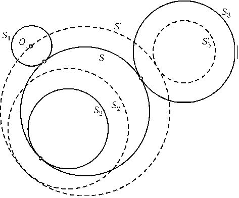 Сведем эту задачу к задаче 28.10. Пусть окружность Sрадиуса rкасается окружностей S1,S2,S3радиусов r1,r2,r3соответственно. Касание окружности Sс каждой из Si(i= 1, 2, 3) может быть как внешним, так и внутренним, поэтому всего возможно восемь различных случаев касания. Пусть, например,Sкасается S1и S3внешним, а S2 — внутренним образом (рис.). Заменим окружности S,S2,S3на концентрические им окружности S',S2',S3' так, чтобы S'касалась S2' и S3' и проходила через центр O1окружности S1. Для этого достаточно, чтобы радиусы S',S2',S3' равнялисьr+r1,r2+r1, |r3-r1|. Обратно, по окружности S', проходящей через O1и касающейся S2' и S3' (внешне, еслиr3-r1$\ge$0, и внутренне, еслиr3-r1< 0), мы можем построить окружность S, дающую решение задачи, уменьшив радиус S'на r1. Построение такой окружности S'описано в решении задачи 28.10(если виды касания заданы, то окружность строится однозначно). Таким же способом можно выполнить построение и в остальных возможных вариантах касания.