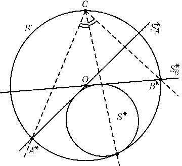 Сделаем инверсию с центромC, при которой прямаяABпереходит в окружностьS', проходящую через точку пересечения окружностейSAиSB(отличную от точкиC). При такой инверсии окружностиSAиSBпереходят в прямые, проходящие через центрOокружностиS'(рис.). Ясно, что окружностьSкасается окружностиS'в середине дугиAB*.