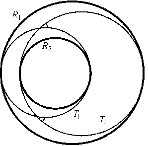 Докажите, что для двух непересекающихся окружностей R1и R2цепочка из nкасающихся окружностей (см. предыдущую задачу) существует тогда и только тогда, когда угол между окружностями T1и T2, касающимися R1и R2в точках их пересечения с прямой, соединяющей центры, равен целому кратному угла360o/n(рис.).