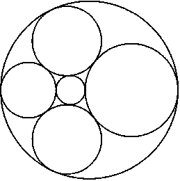 Каждая из шести окружностей касается четырех из оставшихся пяти (рис.). Докажите, что для любой пары несоприкасающихся окружностей (из этих шести) их радиусы и расстояние между центрами связаны соотношениемd2=r12+r22±6r1r2(к плюск — если окружности не лежат одна внутри другой, к минуск — в противном случае).