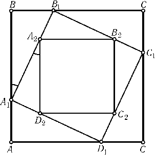Любой параллелограммABCDаффинным преобразованием можно перевести в квадрат (для этого нужно треугольникABCперевести в равнобедренный прямоугольный треугольник). Поскольку в задаче идет речь только о параллельности прямых и об отношениях отрезков, лежащих на одной прямой, можно считать, чтоABCD — квадрат. Рассмотрим поворот на90o, переводящийABCDв себя. При этом повороте четырехугольникиA1B1C1D1и A2B2C2D2тоже переходят в себя, следовательно, они тоже являются квадратами. При этомtgBA1B1=BB1:BA1=A1D2:A1A2=tgA1A2D2, т. е.AB|A2D2(рис.).