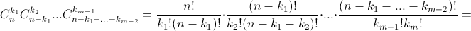 из произведения скобок (x1 + ... + xm)...(x1 + ... + xm) надо выбрать k1 скобок, из которых будет взят множитель x1; k2 скобок, из которых будет взят множитель x2; ..., km скобок, из которых будет взят множитель xm. Первую выборку можно сделать