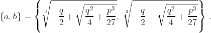 a³ + b³ = – q, a³b³ = (ab)3 = (– p/3)³. Следовательно, a³ + b³ – корни квадратного уравнения t² + qx – p³/27 = 0, то есть