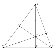 Высота AK, биссектриса BL и медиана CM треугольника АВС пересекаются в точке О, причём АО = ВО.