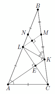 Докажем, что биссектриса KN и медиана LM треугольника BKL перпендикулярны (см. рис.).