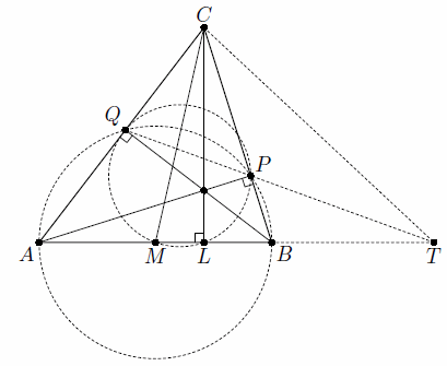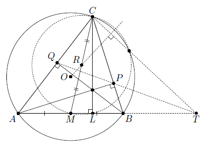 Решение 2: Проведём высоту CL (рис. слева). Заметим, что R – центр описанной окружности прямоугольного треугольника CLM. Докажем, что TC – радикальная ось описанных окружностей треугольников ABC и CLM. Тогда она перпендикулярна линии центров этих окружностей, то есть прямой OR, что и требуется.