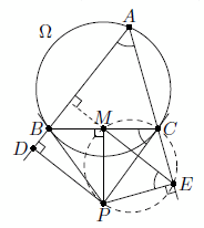 Пусть M – середина BC. Треугольник BPC равнобедренный, значит, его медиана PM является высотой. Поэтому четырёхугольник MCEP вписан в окружность с диаметром CP. Следовательно, ∠MEP = ∠MCP = ∠BAC и ∠MEA + ∠BAC = (90° – ∠MEP) + ∠BAC = 90°, откуда ME ⊥ AB (см. рис.). Аналогично MD ⊥ AC. Это и значит, что M – точка пересечения высот треугольника ADE.