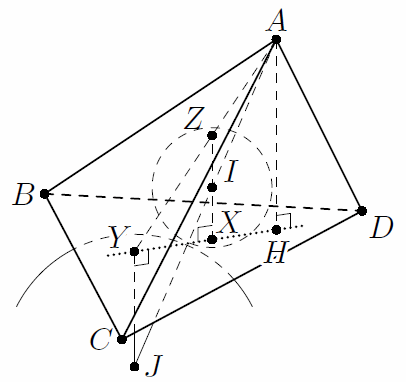 Первый способ. Пусть гомотетия с центром в точке A, переводящая вневписанную сферу во вписанную, переводит точку Y в некоторую точку Z вписанной сферы. Эта гомотетия переводит плоскость (BCD) в плоскость, параллельную (BCD) и касающуюся вписанной сферы в точке Z. Значит, X и Z – диаметрально противоположные точки вписанной сферы, а следовательно, XZ ⊥ (BCD). Поскольку Z лежит на отрезке AY, то ∠AXY > ∠ZXY = 90°