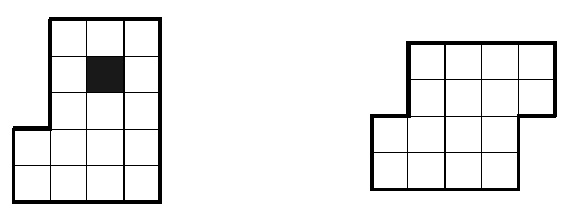 Разрежьте фигуру с вырезанным квадратиком на две одинаковые части, из которых можно составить вторую фигуру. Части разрешается и поворачивать, и переворачивать.
