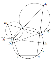 Пятиугольник ABCDE, все углы которого тупые, вписан в окружность ω. Продолжения сторон AB и CD пересекаются в точке E1; продолжения сторон BC и DE – в точке A1. Касательная, проведённая в точке B к описанной окружности треугольника BE1C, пересекает ω в точке B1; аналогично определяется точка D1. Докажите, что B1D1 || AE.