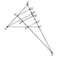 На сторонах AB и AC треугольника ABC взяты точки E и F. Прямые EF и BC пересекаются в точке S. Точки M и N – середины отрезков BC и EF соответственно. Прямая, проходящая через вершину A и параллельная MN, пересекает BC в точке K. Докажите, что BK : CK = FS : ES.