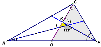 ∠AIB = 90° + ½ ∠C > 90°, то в полученном треугольнике KLI угол при вершине I равен 45°. Значит, ∠AIB = 135°, поэтому ∠AСB = 90°. Следовательно, ОС = ОА = OB.