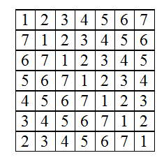 Заметим, что числа в каждом ряду таблицы различны. Кроме того, для любого клетчатого прямоугольника сумма чисел, стоящих в его противоположных углах, равна по модулю 7 сумме чисел, стоящих в двух других противоположных углах. При разрешённых перестановках эти свойства, очевидно, сохраняются. Поэтому итоговая таблица полностью определяется своими верхней строкой и левым столбцом. С другой стороны, перестановками столбцов можно получить любую из 7! перестановок чисел в верхней строке, а перестановками строк со второй по седьмую – любую из 6! перестановок чисел в шести нижних клетках левого столбца.