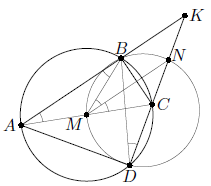 MN – средняя линия в треугольнике AKC, поэтому ∠BAC = ∠NMC. Кроме того, ∠BAC = ∠BDC, так как четырёхугольник ABCD – вписанный.