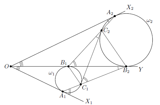 В равные углы X1OY и YOX2 вписаны окружности ω1 и ω2, касающиеся сторон OX1 и OX2 в точках A1 и A2 соответственно, а стороны OY – в точках B1 и B2. C1 – вторая точка пересечения A1B2 и ω1, а C2 – вторая точка пересечения A2B1 и ω2. Докажите, что C1C2 – общая касательная к окружностям.