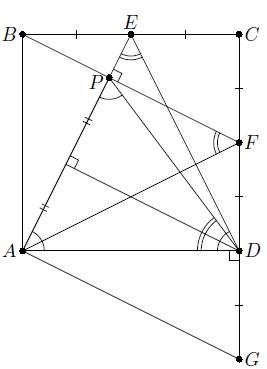 Решение 2:∠APF = 90° = ∠ADF. Значит, четырёхугольник APFD вписан, откуда ∠ADP = ∠AFP = ∠AFB. С другой стороны, ∠AFB = ∠AED, поскольку треугольники ABF и ADE равны.