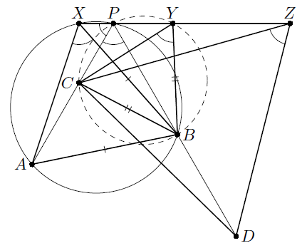 ∠(CP, PB) = ∠(AX, XB) = 60° = ∠(CY, YB), то есть точки B, C, P, Y также лежат на одной окружности. Таким образом, точка P является второй точкой пересечения прямой XZ и описанной окружности треугольника BCY. Аналогично показывается, что прямая BD также проходит через эту точку. (В случае, если эти окружность и прямая касаются, P совпадает с Y, и все три прямые проходят через Y.)
