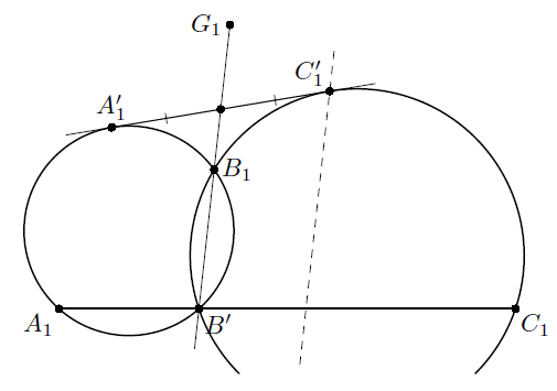 Отсюда вытекает следующее построение. Построим l1 – образ прямой B'G (на которой лежит B1) при гомотетии с центром A'1 и коэффициентом 2; эта прямая содержит C'1. Значит, её инверсный образ содержит точку C'. Проведя аналогичное построение, начиная с инверсии в точке A', получим вторую окружность, содержащую C', и, значит, сможем восстановить точку C' (вообще говоря, двумя способами). После этого восстанавливаются описанная окружность треугольника A'B'C' и стороны исходного треугольника, являющиеся касательными к ней.