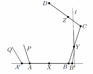 Пусть P – исходный многоугольник, Q – некоторый правильный многоугольник, содержащий на периметре наши пять точек, α и β – углы этих многоугольников. Прямая AB должна содержать сторону многоугольника Q, так как на ней лежат три отмеченных точки. Пусть эта сторона – A'B'. Далее, пусть сторона Q, содержащая Y, лежит на прямой l; тогда точки B и Z должны лежать по одну сторону от неё (см. рис.).