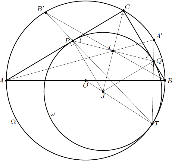 Рассмотрим окружность ω, касающуюся AC, BC в точках P, Q соответственно, и касающуюся Ω изнутри в точке T; нам надо доказать, что J – центр ω. Так как T – центр гомотетии ω и Ω, прямые TP, TQ вторично пересекают описанную окружность в точках, касательные в которых параллельны AC и BC, то есть в серединах B', A' дуг AC, C. Поэтому прямые AA' и BB' пересекаются в точке I. По теореме Паскаля (см. задачу 157105), применённой к ломаной CAA'TB'B, точки P, I, Q лежат на одной прямой. Поскольку прямая PQ перпендикулярна биссектрисе угла C, P, Q – проекции J на AC и BC, что и означает, что J – центр ω.
