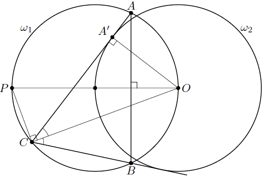 Пусть R – радиус окружностей, O – центр ω2, P – точка на ω1, диаметрально противоположная к O, а A' – точка касания AC и ω2. Так как CO – биссектриса угла ACB, точки A и B симметричны относительно прямой OP.