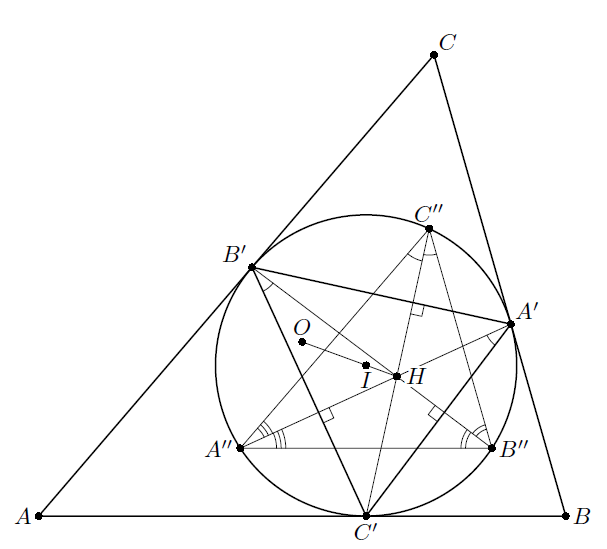 ∠A''C''C' = ∠A''A'C' = 90° – ∠A'C'B' = ∠B''B'C' = ∠B''C''C'; это значит, что хорда A''B'' параллельна касательной к ω в точке C', то есть A''B'' || AB. Поэтому стороны треугольников ABC и A''B''C'' параллельны друг другу, а H – центр вписанной окружности треугольника A''B''C''. Следовательно, существует гомотетия, переводящая треугольник ABC в A''B''C''. При этой гомотетии центр описанной окружности O переходит в I, а точка пересечения биссектрис I – в H. Таким образом, точка H лежит на прямой OI, причем OI : IH = R : r.