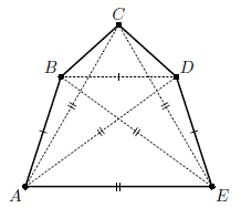 На рисунке изображен пятиугольник ABCDE, у которого диагонали AC, AD, BE и CE равны стороне AE, а диагональ BD равна сторонам AB и DE. Покажем, как он может быть получен.