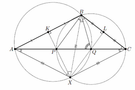 Из доказанного следует, что AX = XB = XC, то есть ∠PBX = ∠XCA = ∠XAC = ∠QBX, поэтому BX – биссектриса угла PBQ.