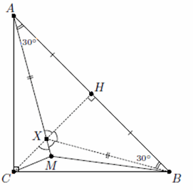 Рассмотрим отдельно треугольник CXB. В нём ∠XCB = 45°, ∠XBC = 15°, ∠CXB = 120° и XM – биссектриса угла CXB (см. рис.).