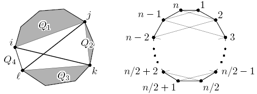 Пусть теперь найдутся две пересекающихся хороших диагонали AiAk и AjAl (i < j < k < l). Тогда каждая из них не пересекается с другими проведёнными диагоналями. Выбросим AiAk и AjAl из рассмотрения. Каждая оставшаяся проведённая диагональ d является диагональю или стороной ровно в одном из многоугольников Q1 = Ai...Aj, Q2 = Aj...Ak, Q3 = Ak...Al или Q4 = Al...AnA1...Ai (рис. слева). При этом, если d является стороной одного из них, то она не может пересекаться с другими диагоналями (и потому не является хорошей).