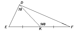 В треугольнике DEF проведена медиана DK. Найдите углы треугольника, если ∠KDE = 70°, ∠DKF = 140°.