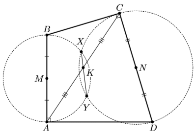 Решение 1:Пусть M, N – середины AB, CD соответственно. Тогда степень точки K относительно окружности с диаметром AB равна KM² – MA² = ¼ (CB² – AB²), а относительно окружности с диаметром CD – ¼ (AD² – CD²). Так как AB² + AD² = BD² = BC² + CD², эти степени равны, то есть точка K лежит на радикальной оси XY двух окружностей.