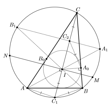 Решение 1: Обозначим через A1, B1 и C1 середины дуг BC, CA и AB, не содержащих других вершин треугольника ABC (рис. слева), через A0 и B0 – точки касания вписанной окружности со сторонами BC и CA соответственно, а через C2 – точку пересечения A1B1 и CC1.