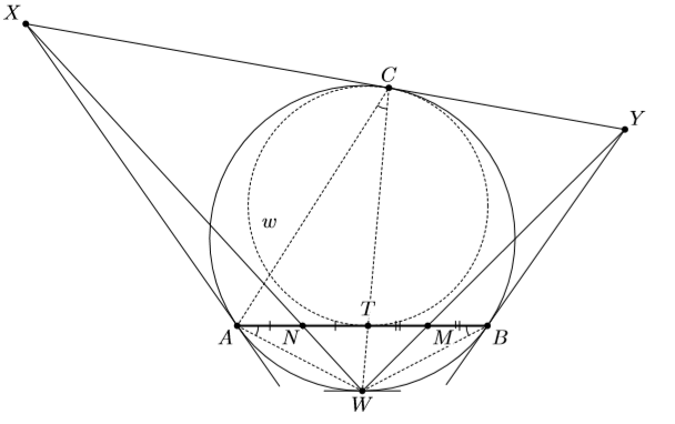 Даны окружность, её хорда AB и середина W меньшей дуги AB. На большей дуге AB выбирается произвольная точка C. Касательная к окружности, проведённая из точки C, пересекает касательные, проведённые из точек A и B, в точках X и Y соответственно. Прямые WX и WY пересекают прямую AB в точках N и M соответственно. Докажите, что длина отрезка NM не зависит от выбора точки C.